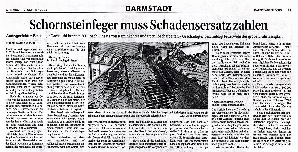 Schornsteinfegerin stürzt vom Dach Schornsteinfeger muss Schadensersatz zahlen Echo-Online Ein Schornsteinfegermeister muss 2200 Euro Schadensersatz an einen Bessunger Glasermeister zahlen, dessen Haus vor viereinhalb Jahren infolge von Ausbrennarbeiten des Kaminkehrers und trotz vorheriger Löscharbeiten der Feuerwehr zum Teil ausgebrannt ist. Die Anklage lautete auf fahrlässige Brandstiftung. ...Gegen drei Uhr nachts bemerkte der Sohn des Glasermeisters, der im Vorderhaus wohnte, dass der Dachstuhl brannte. Dort lebte die bettlägerige Mutter des Glasermeisters. „Sie hat nur überlebt, weil das Dach kaputt war und der Rauch dadurch abzog“, regte sich der Bessunger vor Gericht auf. ...Angeklagt sei der Schornsteinfeger. Zu seinen Lasten urteilte das Gericht, dass er nach dem Anruf des Glasermeisters nicht zu dem Haus fuhr und den Kamin kontrollierte. „Mir ist nichts gesagt worden, sonst wäre ich hingefahren“, betonte der Kaminkehrer. „Aber ein Gefahrenpotenzial habe ich da nicht gesehen.“ ...Staatsanwalt: „Der Angeklagte hat die Ursache gesetzt. Den Brand hätte man mit Sicherheit verhindern können, wenn er nochmal hingefahren wäre.“ Den damals festgestellten Sachschaden von 500 000 Mark hat zum größeren Teil die Versicherung gezahlt.... (.jpg) Schornsteinfeger verliert Kehrbezirk ESSLINGEN. Das Landratsamt Esslingen hat die Bestellung eines Bezirksschornsteinfegermeisters widerrufen. Der Mann legte gegen die sofortige Wirkung des Widerrufs Einspruch ein, das Verwaltungsgericht Stuttgart hat den Einspruch nun abgelehnt.Einem von insgesamt 42 Bezirksschornsteinfegermeistern im Landkreis Esslingen hat das Landratsamt nach seiner Bestellung im Jahr 1998 die Position im März dieses Jahres wieder entzogen. Gegen die sofortige Wirkung des Widerrufs legte der Schornsteinfeger beim Verwaltungsgericht Einspruch ein. In einem Eilverfahren hat das Verwaltungsgericht Stuttgart den Einspruch abgelehnt. Die Konsequenz: der Mann darf vorläufig als Geselle bei einem Meister Schornsteine fegen, aber nicht mehr als selbstständiger Bezirksschornsteinfegermeister arbeiten.Das Gericht führte aus, dass die Bestellung zum Bezirksschornsteinfegermeister zu widerrufen sei, wenn die Person "nicht die erforderliche persönliche oder fachliche Zuverlässigkeit für die Ausübung seines Berufes" besitze. Im vorliegenden Fall sei „besonders schwer wiegend" gegen berufliche Verpflichtungen verstoßen worden. Der Schornsteinfeger habe unter anderem die erforderlichen Aufzeichnungen mangelhaft geführt, in zahlreichen Fällen überhöhte Gebühren verlangt oder Gebühren nicht eingezogen. Falsche Schornssteinfeger "Schornsteinfeger stürzte vom Dach" ...und hier leider noch so ein unnötiger Unfall! Kaminkehrer stürzt in Steinach fast 6,5 Meter in die Tiefe 27-Jähriger zieht sich schwere Verletzungen zu. In freiem Fall ist ein Kaminkehrer von einem Dach 6,5 Meter in die Tiefe gestürzt. Der 27-Jährige wurde dabei schwer verletztt. Der Mann wollte um 7.50 Uhr in Steinach den Kamin eines Hauses kehren. Dazu stieg er auf einer Holzleiter auf das Dach. Der westliche Dachflügel war zu diesem Zeitpunkt noch mit Reif bedeckt. Als der Kaminkehrer das Dach betrat, verlor er den Halt. Er rutschte etwa zehn Meter auf dem glatten Ziegeldach dahin, bevor er auf die asphaltierte Straße stürzte. Die Nachbarn hatten den Vorfall beobachtet und sofort die Rettung verständigt. Nach der Erstversorgung wurde der Mann in die Klinik nach Innsbruck gebracht. Kaminkehrer im Pech Unfall unter Alkohol: Weiden. Selbst Pech hatte ein Bezirkskaminkehrermeister aus dem Landkreis Neustadt, obwohl er Glück bringen soll: Der 39-Jährige verursachte im Oktober mit 1,21 Promille einen Unfall.... Auf der Heimfahrt über die A 93 war der Schornsteinfeger am späten Nachmittag aus Unaufmerksamkeit auf ein Fahrzeug aufgefahren. Schuld war seine Alkoholisierung.... Es sei halt ein "bedauerliches Vorkommnis" gewesen. Bei seinem letzten "guten" Kunden habe er sich einige Biere gegönnt. 1,21 Promille am Nachmittag deuteten auf Alkoholgewöhnung hin. Erst kam der Kaminkehrer, dann brannte das Haus Schwerer Raub durch falschen Schornsteinfeger Am Montag, hat ein Schornsteinfeger überlebte 7-Meter-Sturz MÜHLTROFF - Jörg Hering (38), Geselle im Betrieb seines Bruders, besteigt seit fast 20 Jahren die Dächer rund um Plauen. .... Da kletterte Hering auf das Haus von Familie Schubert im Ortsteil Langenbach. Karina Schubert (35): „Plötzlich hörte ich einen dumpfen Knall.“ Ihr Mann Ulli (40) rannte in den Garten. Dort lag der Schornsteinfeger – bewusstlos. Hering war auf dem Dach ausgerutscht, konnte sich nicht mehr halten. Er sauste, den Kopf zuerst, immer schneller über die Ziegel. Dann stürzte er auf den Rasen. Die Hausbewohner alarmierten sofort den Notarzt. Diagnose: Prellungen und eine Gehirnerschütterung - alles nicht sehr bedrohlich.